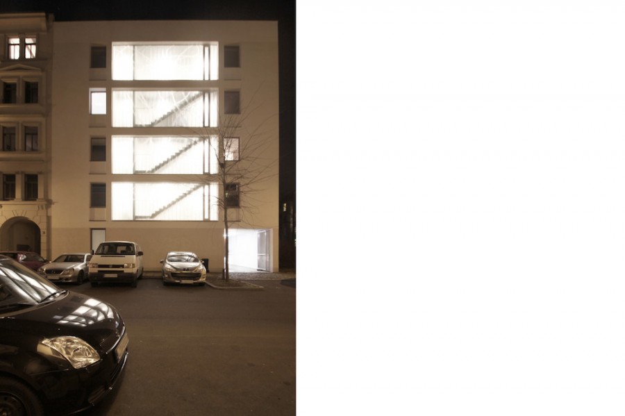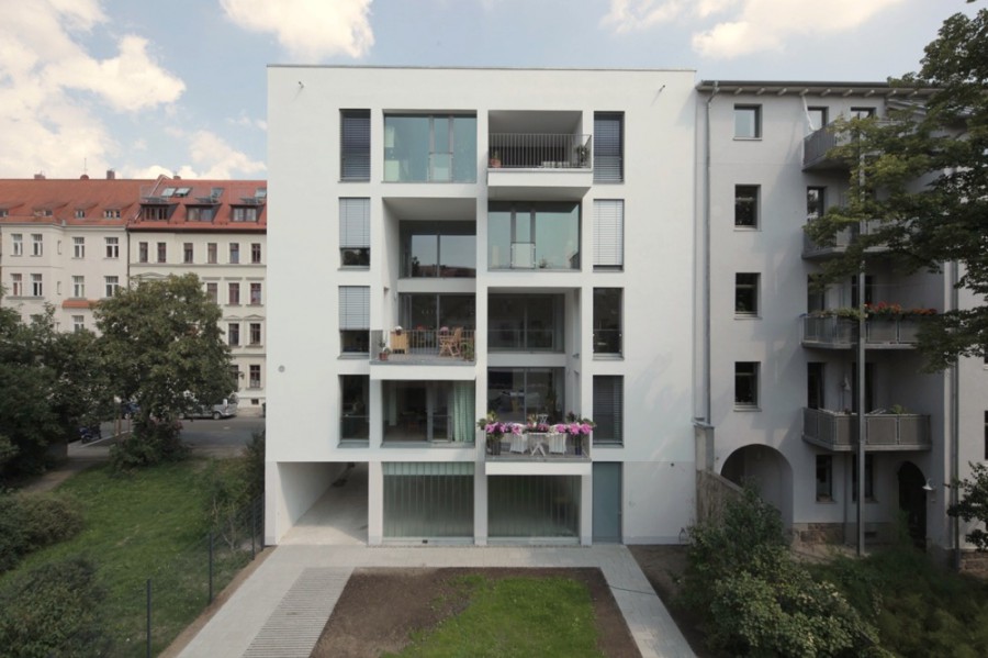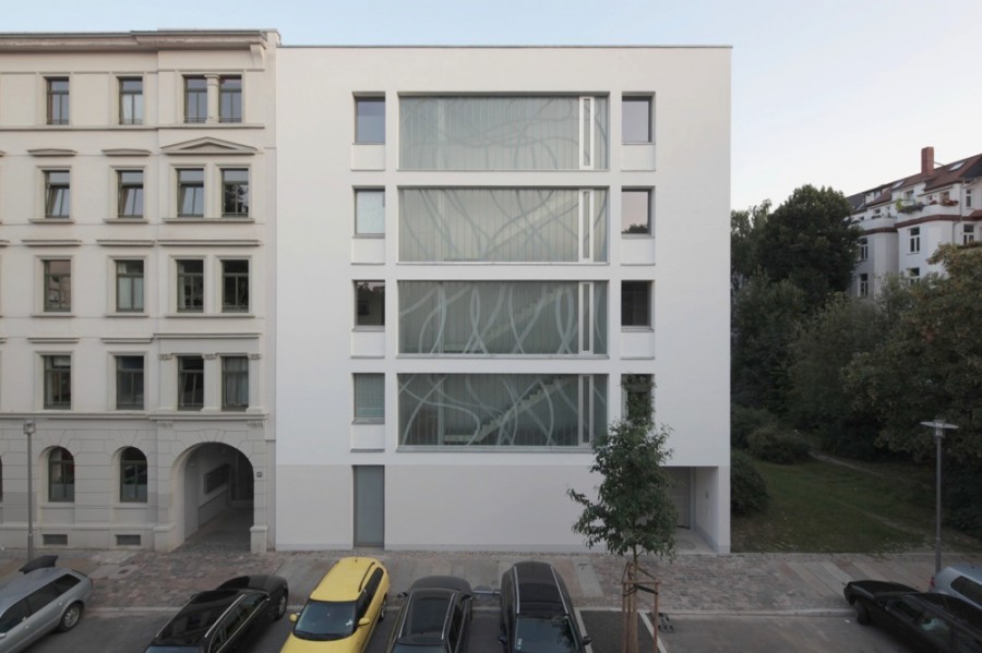 Das Projekt für eine Bauherrengemeinschaft wurde als Blockrandschließung in der Leipziger Südvorstadt konzipiert. Das Dreifamilienhaus vereint typologisch Qualitäten eines Einfamilienhauses mit dem einer Etagenwohnung. Ineinandergesteckte Maisonettewohnungen erlauben zweigeschossige Innenräume, die sich außen als Loggien zur Südseite fortsetzen. Die Erschließung erfolgt konsequenterweise im Norden. An der Straßenseite wurden im EG Parkplätze angeordnet.