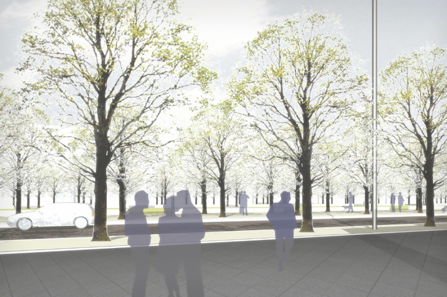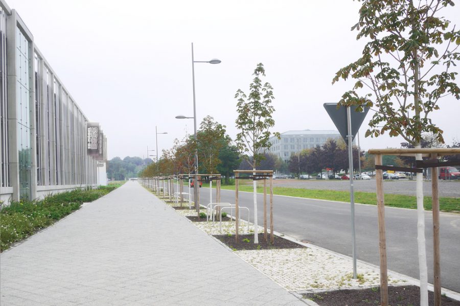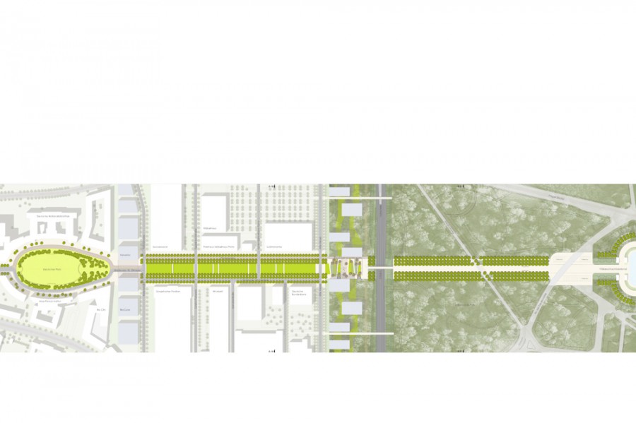 Für den zentralen Freiraum auf dem Gelände der alten Messe / Straße des 18. Oktobers, wurde ausgehend vom historischen Konzept, eine Neugliederung des Straßen- und Freiraumes entwickelt. Dieser Freiraum ist einerseits ein wichtiger Teil der Achse Rathaus-Völkerschlachtdenkmal, andererseits der Kern des alten Messegeländes, welches sich gerade in einen neuen Forschungs- und Dienstleistungsstandort wandelt. Eine sechsreihige Allee, eine zentrale Rasenfläche und eine multifunktional nutzbare Straßenfläche sind die wichtigsten Elemente. Material und Ausstattung orientieren sich am Bestand der Umgebung.