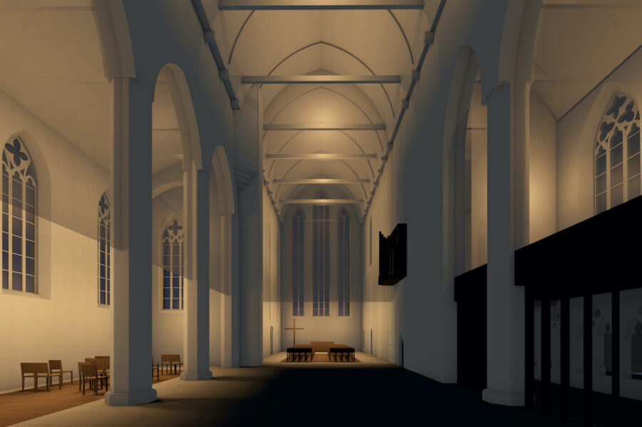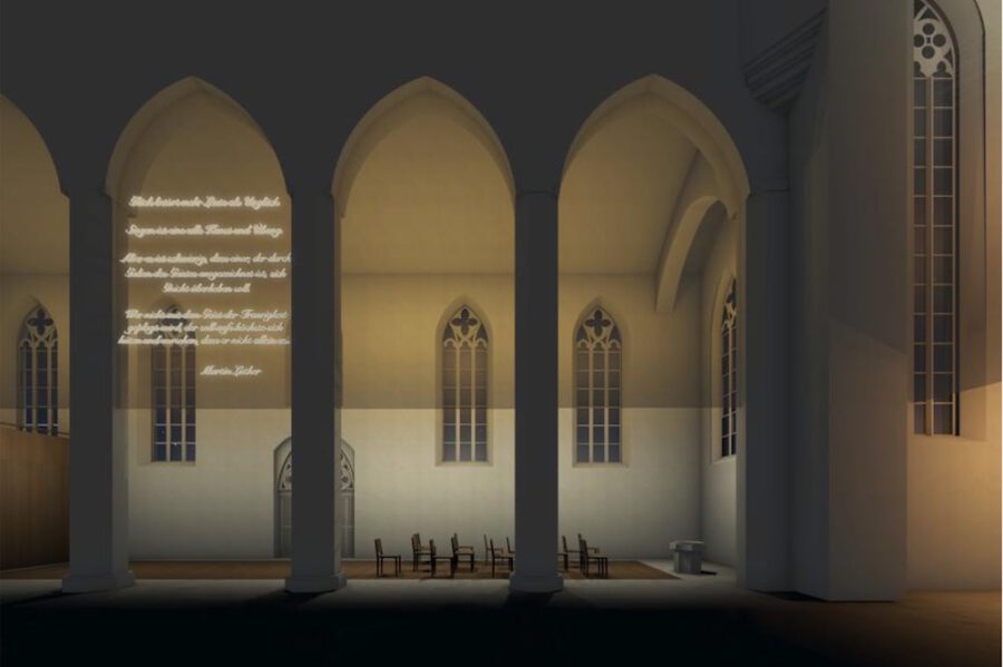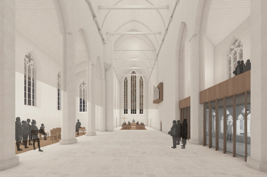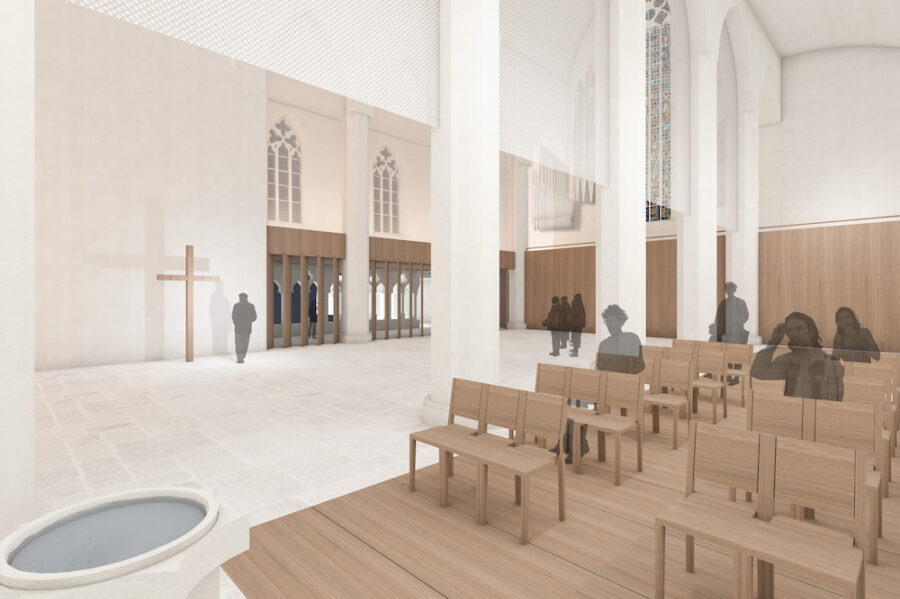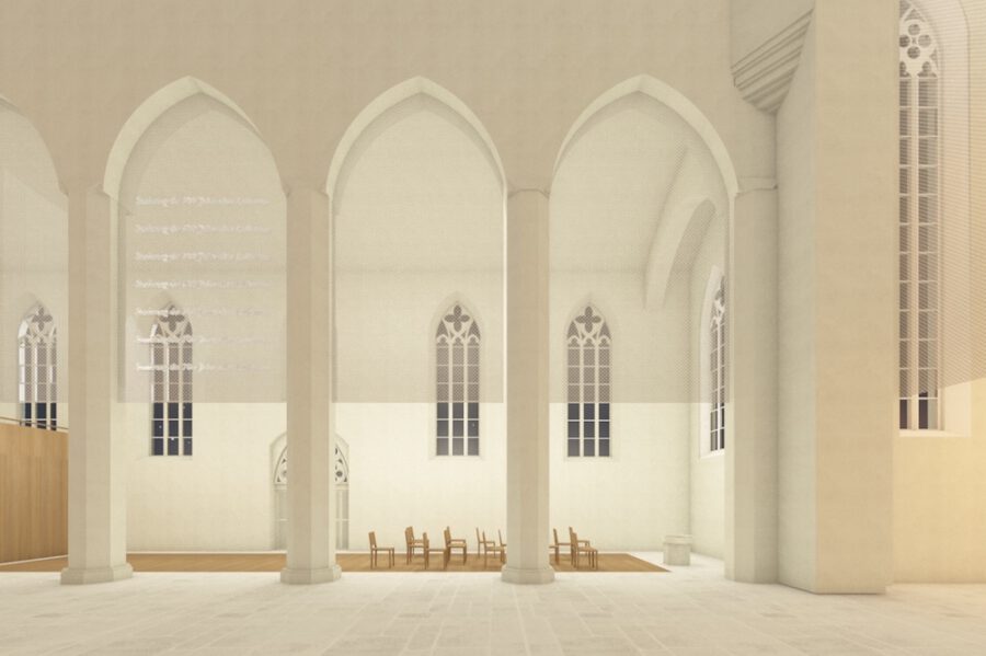 Der Innenraum der Augustinerkirche soll umgestaltet werden. Durch reduzierte Eingriffe wird der Raum klarer orientiert und gleichzeitig flexibler bespielbar. Der Boden wird auf ein durchgehendes Niveau gebracht. Die neuen Möbel und wenige neue Einbauten werden in einem einheitlichen Holzton umgesetzt. Ein zarter, metallischer Vorhang markiert den Chor und das Seitenschiff und ist gleichzeitig medial und variabel bespielbar. Die Öffnung des Kreuzgangs stärkt den das Klosterensemble.
