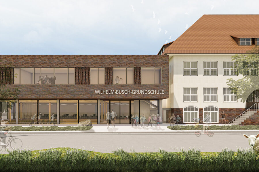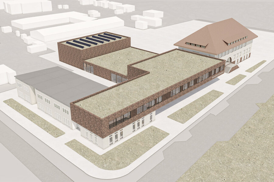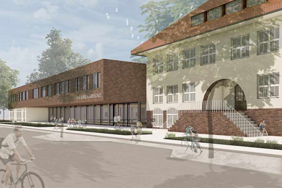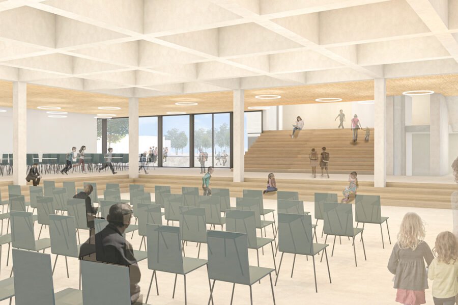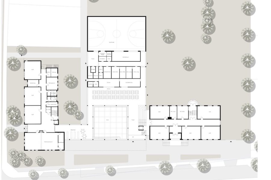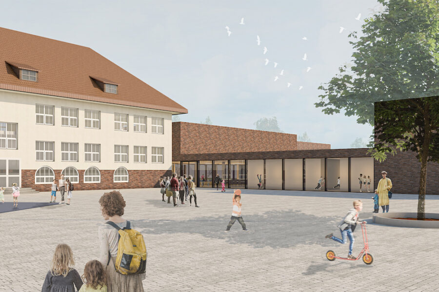 Der Neubau verbindet respektvoll die vorhandenen Bestandsbauten. Die Aula und die neue Mensa bilden gemeinsam mit einem neuen Eingangsbereich sowie der neuen Sporthalle das Herzstück der Grundschule. Gleichzeitig ist der Bereich als überdachter, schallgeschützter Pausen- oder Veranstaltungsbereich nutzbar.
