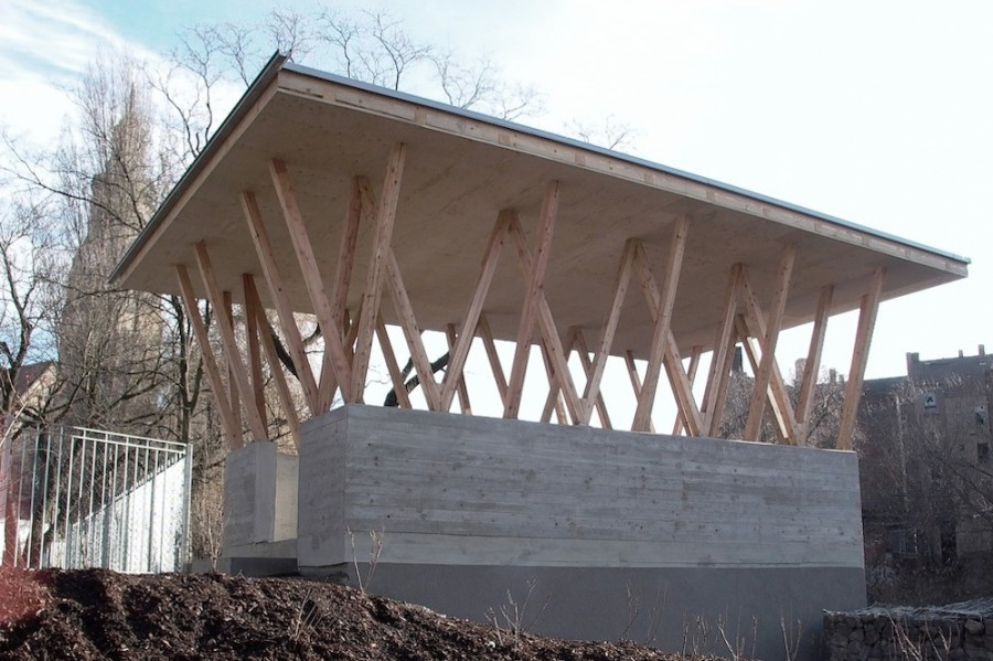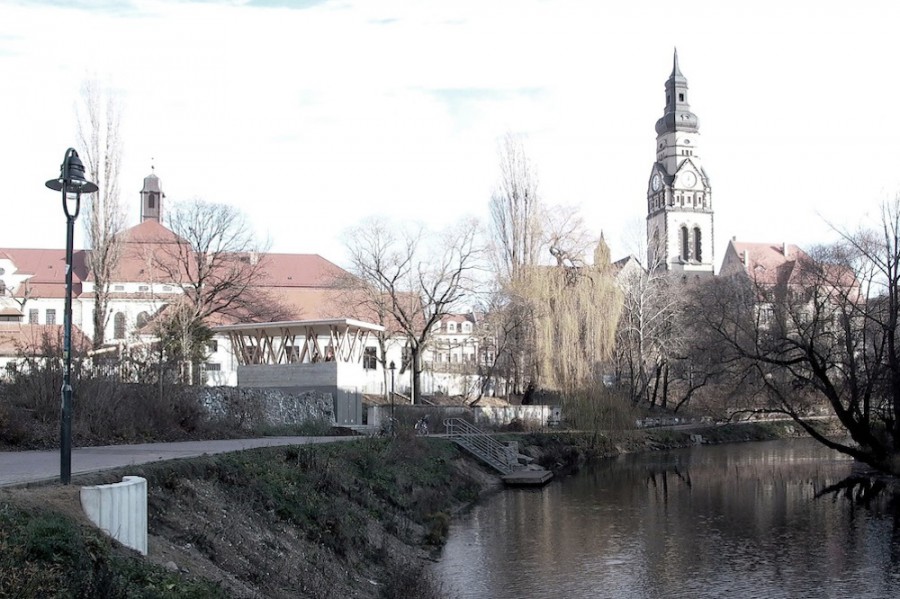 Am Karl-Heine-Kanal wurde ein einstiges Garagengebäude saniert und aufgestockt. Damit entstand zum einen ein kleines Bootshaus für die benachbarte Schule, zum anderen ein öffentlicher, überdachter Aussichtspunkt am Kanal. Eine hölzerne Dachscheibe lagert auf den geometrisch gekippten Stützen, die mit der neuen Stahlbetonaufkantung verbunden sind.