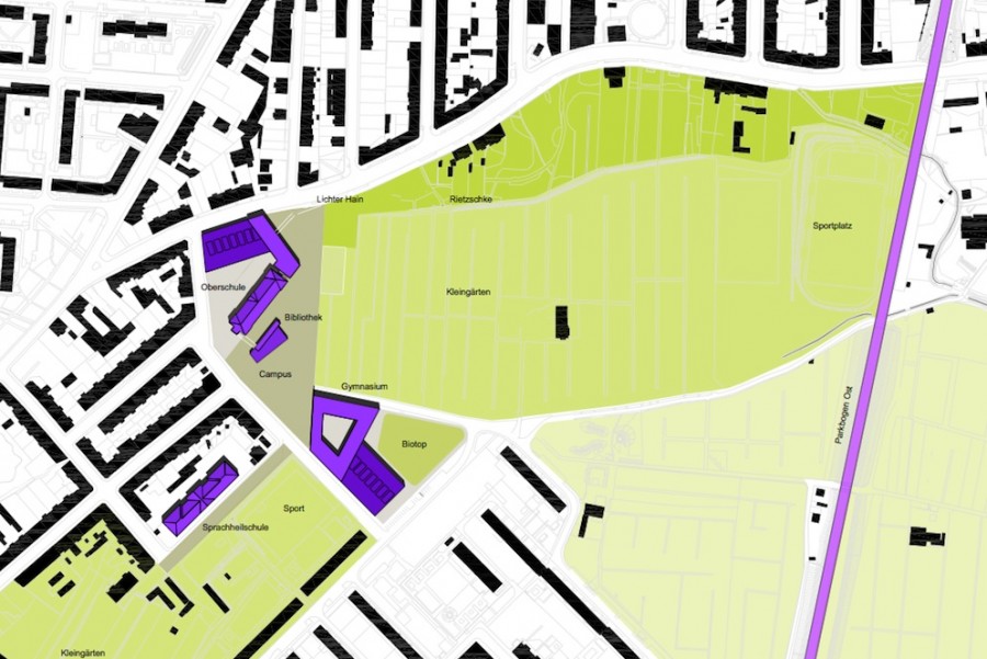 Mittelpunkt des Konzeptes ist ein neuer Freiraum südlich der Wurzner Straße, der alle Bildungsbauten miteinander verknüpft und dadurch tatsächlich die Idee eines Campus umsetzt.