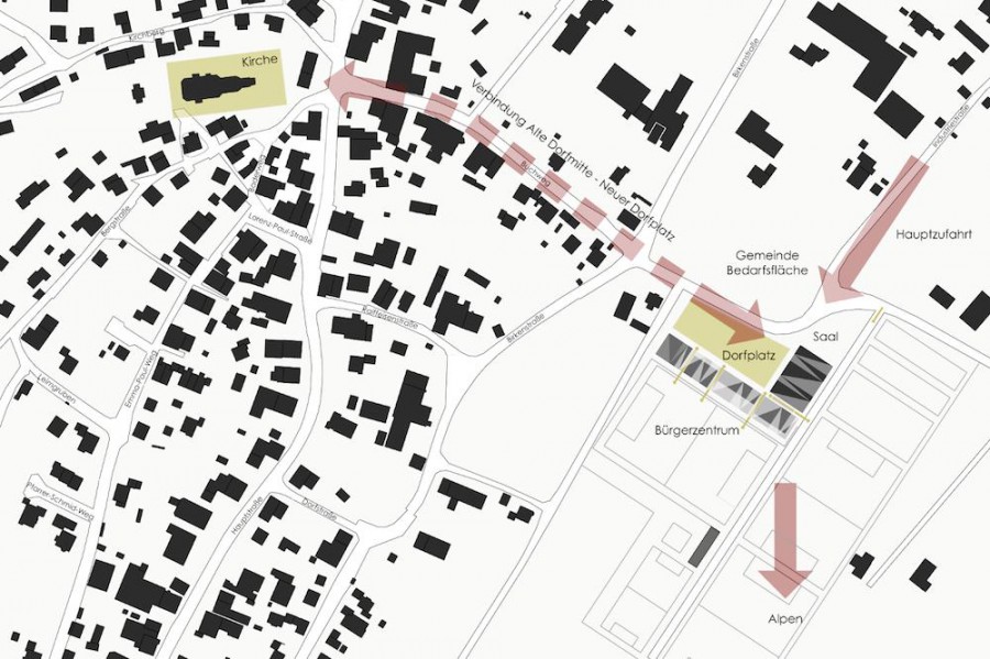 Die Grundidee des Entwurfes besteht darin, mit dem Neubau des Bürger- und Vereinszentrums Denklingen eine „neue Dorfmitte“ zu schaffen, die in unmittelbarem Bezug zum alten Dorfkern steht. Durch die Einordnung des Gebäudeensembles am Schnittpunkt der Hauptzufahrtsstraße (Industriestraße) und der Blickachse (Buchweg) zum Kirchberg, bildet dieses den zukünftigen Mittelpunkt der drei Ortsteile. Zwischen dem Kirchberg und dem neuen Dorfplatz kann sich somit zukünftig eine Achse entwickeln, an der sich weitere Gemeindefunktionen anlagern könnten.