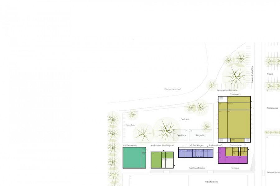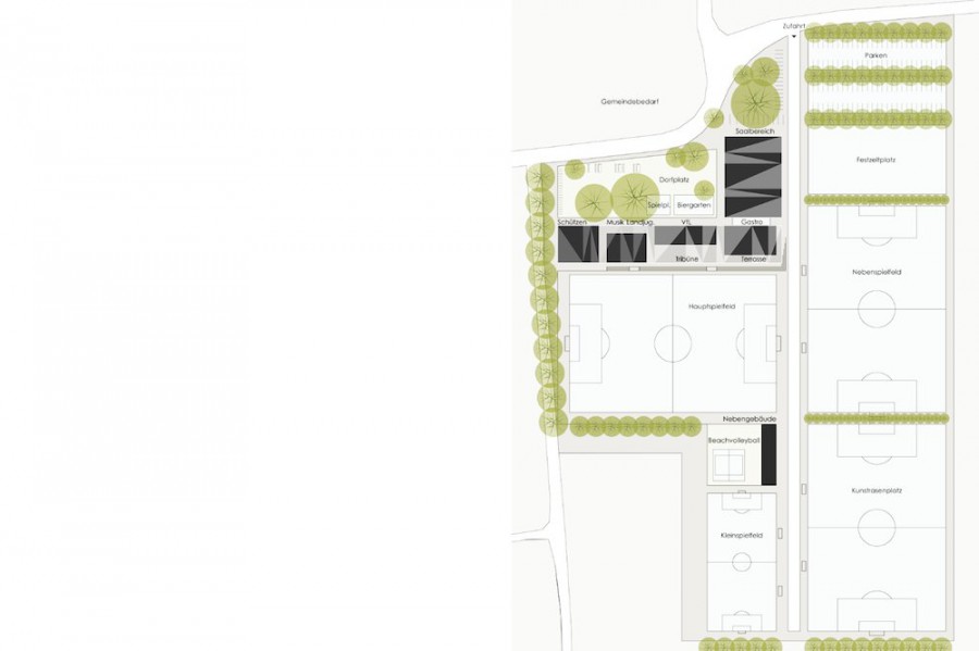 Der Gebäudeteil für den VfL- Denklingen ist so angeordnet, dass zu dem tiefer liegenden Sportplatz eine Tribüne entsteht, die teilweise überdacht ist. Der Musik- und der Landjugendverein werden in einem Gebäude untergebracht, welches vom Platz etwas abgerückt ist. Dadurch entsteht ein Vordachbereich zum Platz. Der Schützenverein bildet den Endpunkt der gesamten Anlage. Die Zufahrt zum Sport- und Vereinsgelände erfolgt vom Buchweg. An einem zentralen Zufahrtsweg werden alle Sport- und Freiraumfunktionen angelagert.