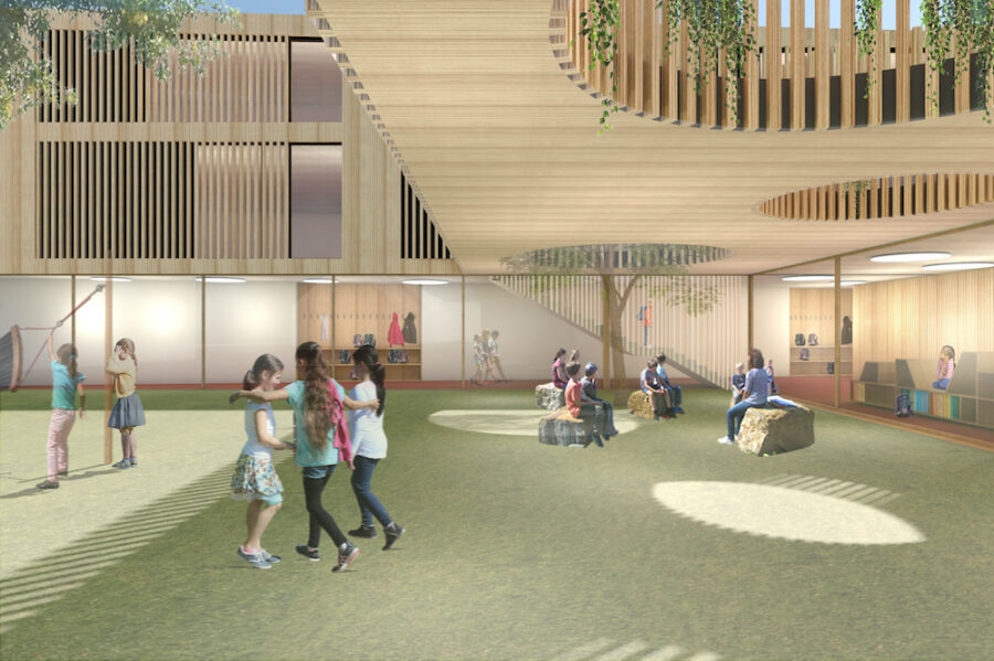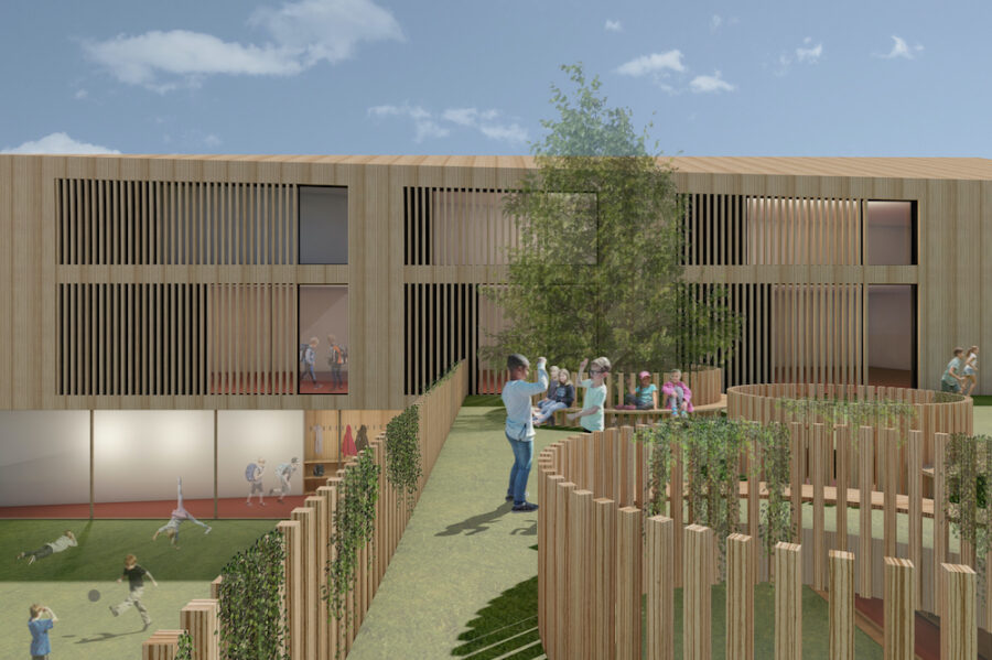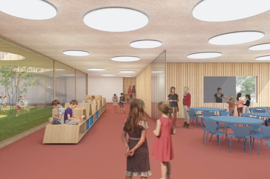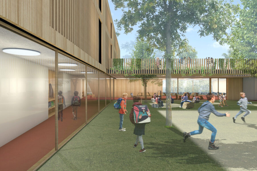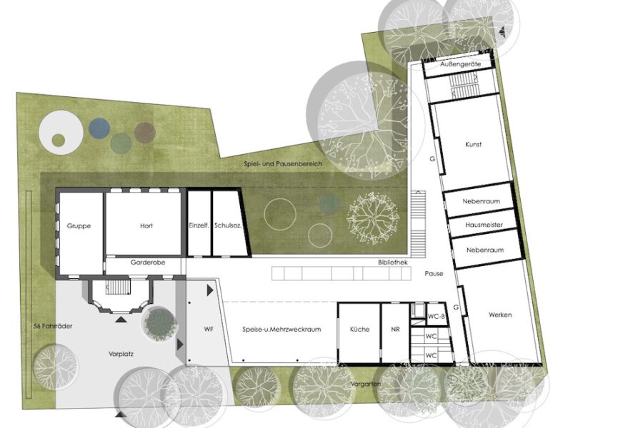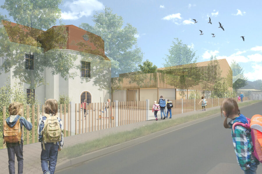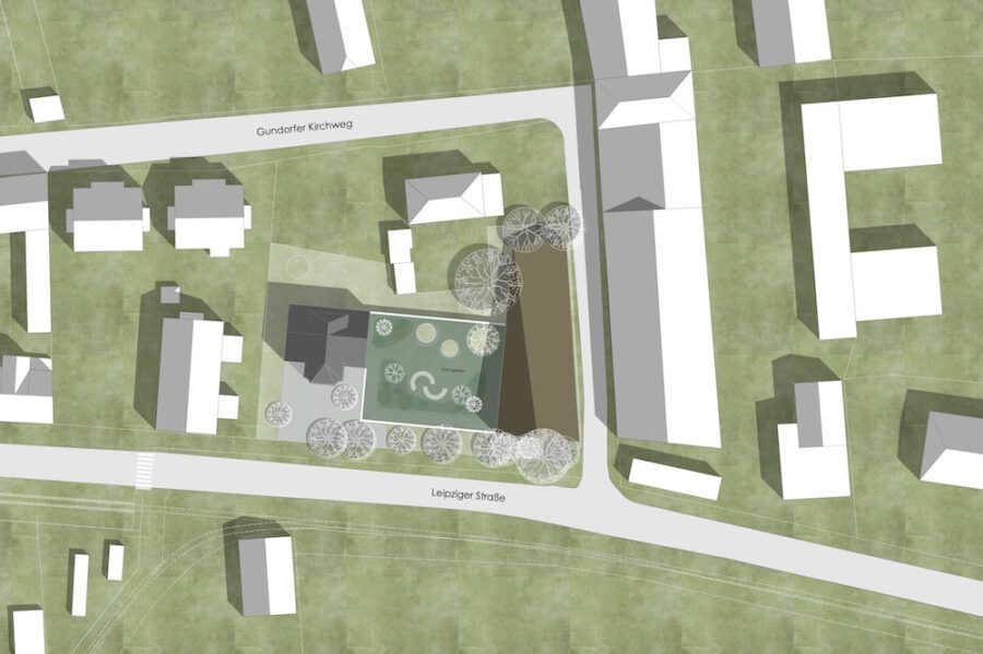 Die Dorfschule Gundorf am Stadtrand von Leipzig soll erweitert werden. Es wird vorgeschlagen, das historische Gebäude weitgehend freizustellen und einen Neubau mit Abstand zu positionieren. Damit werden benachbarte Hofstrukturen aufgenommen und neu interpretiert. Das Sockelgeschoss dient als Verbinder und Kommunikationsraum.