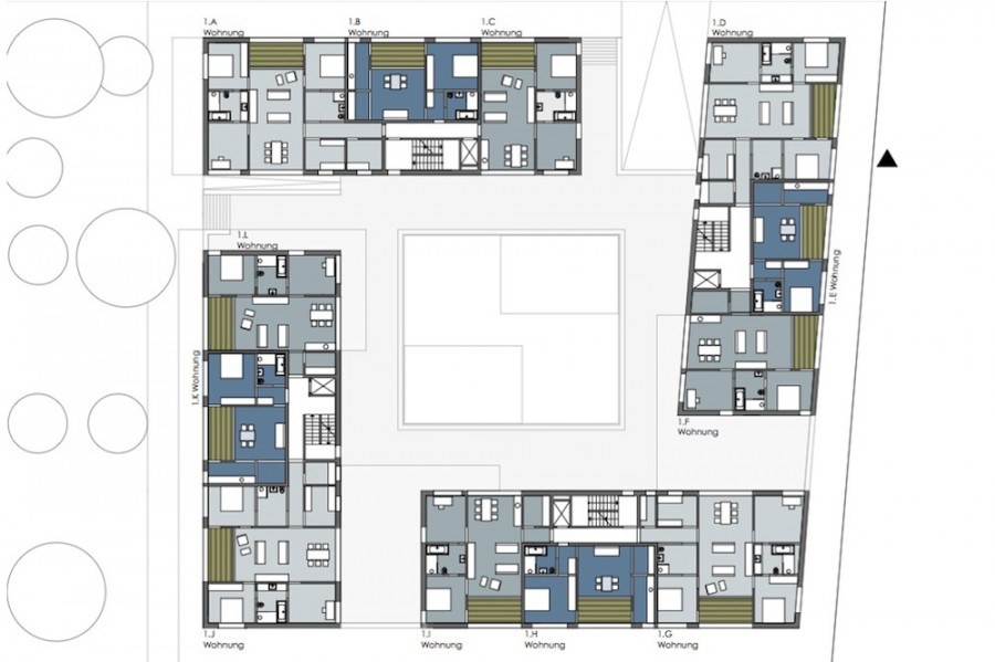 Schwerpunkte waren einerseits, bezahlbaren Mietwohnungsbau zu integrieren, und andererseits einen starken städteabulichen Auftakt der Hafenbebauung am südöstlichen Ende zu formulieren. Die Wohnungen sind auf einem gemeinsamen Sockel mit Stellpätzen und Nebenräumen platziert. In den Obergeschossen bieten die Fugen zwischen den Gebäudeteilen Duchblicke und Belichtung. Das Konzept eines kräftigen Körpers soll durch eine umlaufende Klinkerfassade unterstützt werden.