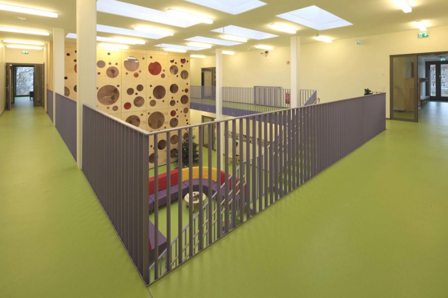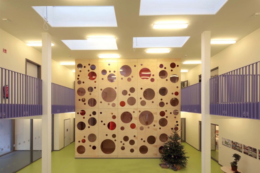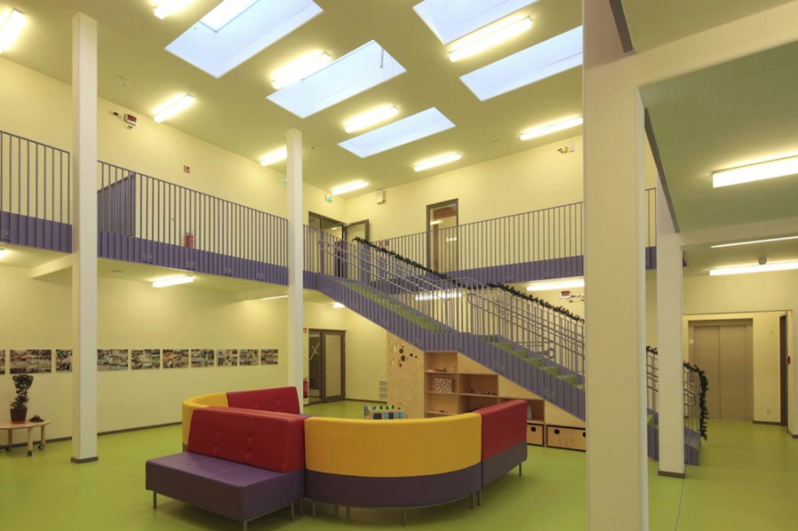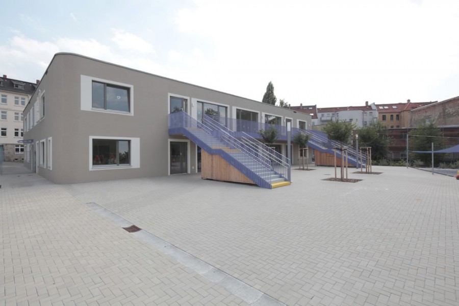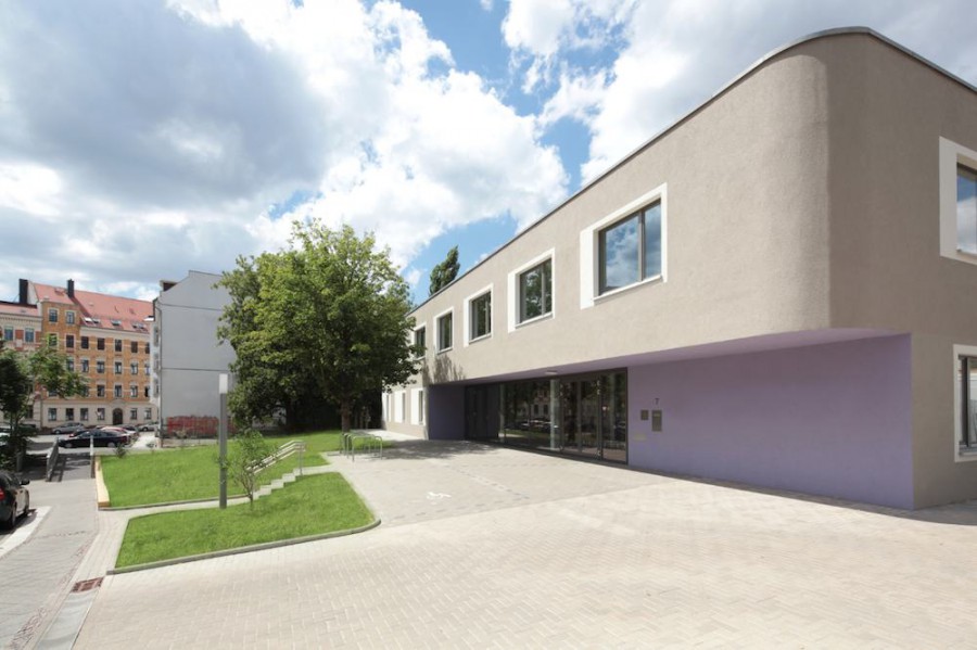 Auf einer Brachfläche im Leipziger Osten wurde ein Kindergarten / Kinderkrippe für 180 Kinder geplant. Sämtliche Räume gruppieren sich um eine kleine zweigeschossige Halle. Gleichzeitig werden kleinere, überschaubare Bereiche mit Ruhezonen geschaffen. Alle Gruppenräume haben die Möglichkeit eines direkten Gartenzugangs.