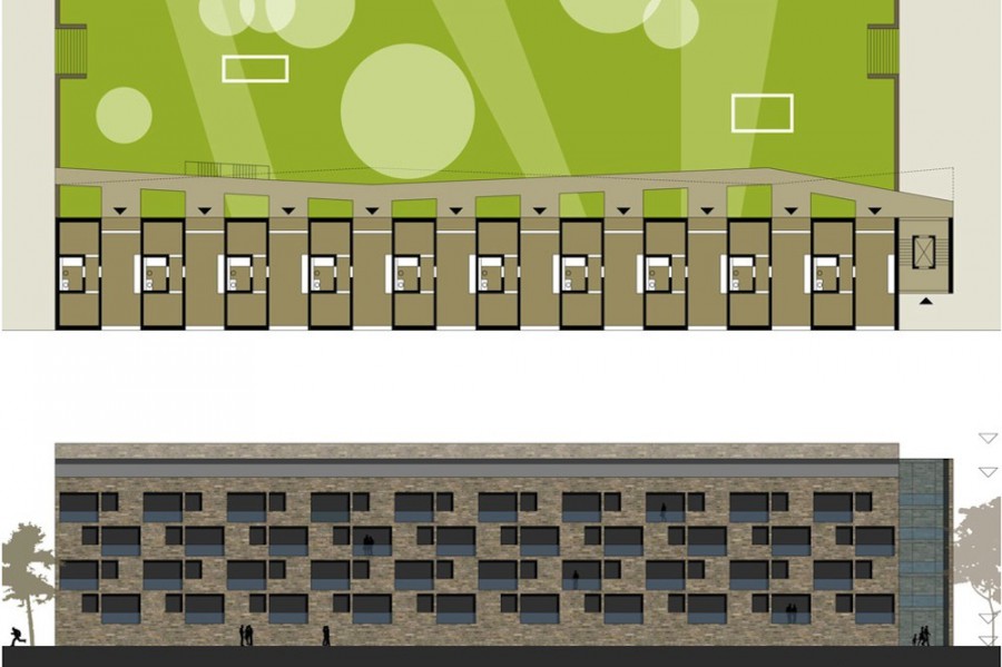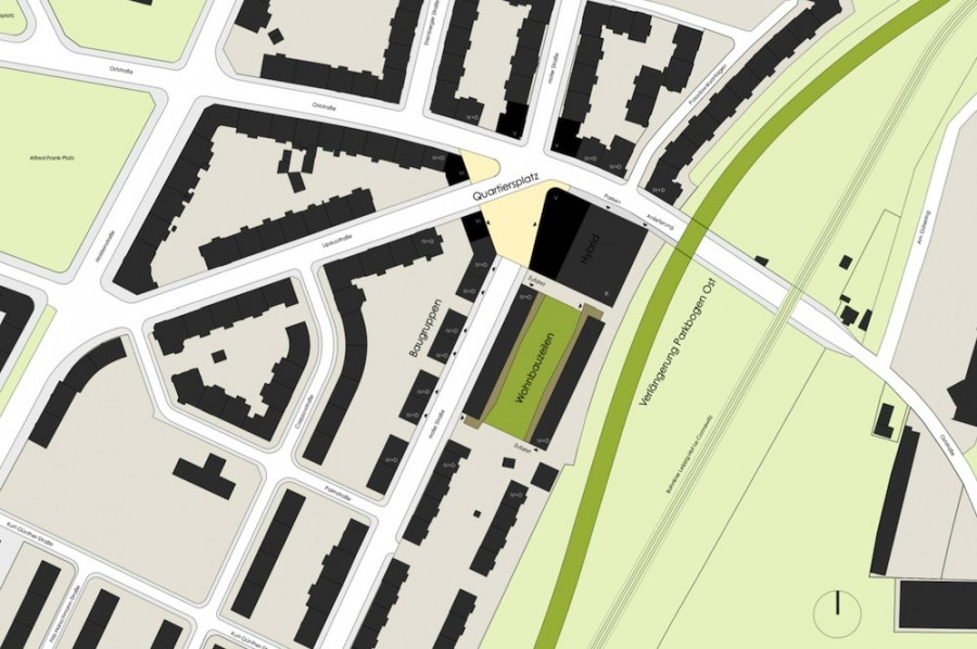 Für das Quartier Hofer Straße / Oststraße in Leipzig Reudnitz wurde eine Konzept für Wohnungsbebauung und ergänzende Nutzungen entwickelt. Im Grundsatz wird die ruhige Hofbebauung der benachbarten Meyerschen Häuser mit den grünen Höfen weitergeführt. An der Oststraße wird ein stadträumlicher Schwerpunkt mit einem Hybriden Gebäude formuliert. Dort werden Parken, Supermarkt, Dreifeldsporthalle und Kita übereinandergestapelt. Für die Wohnbebauung wird ein Laubengangtyp vorgeschlagen, um die Erschließung der kleinen Wohnungen zu optimieren.