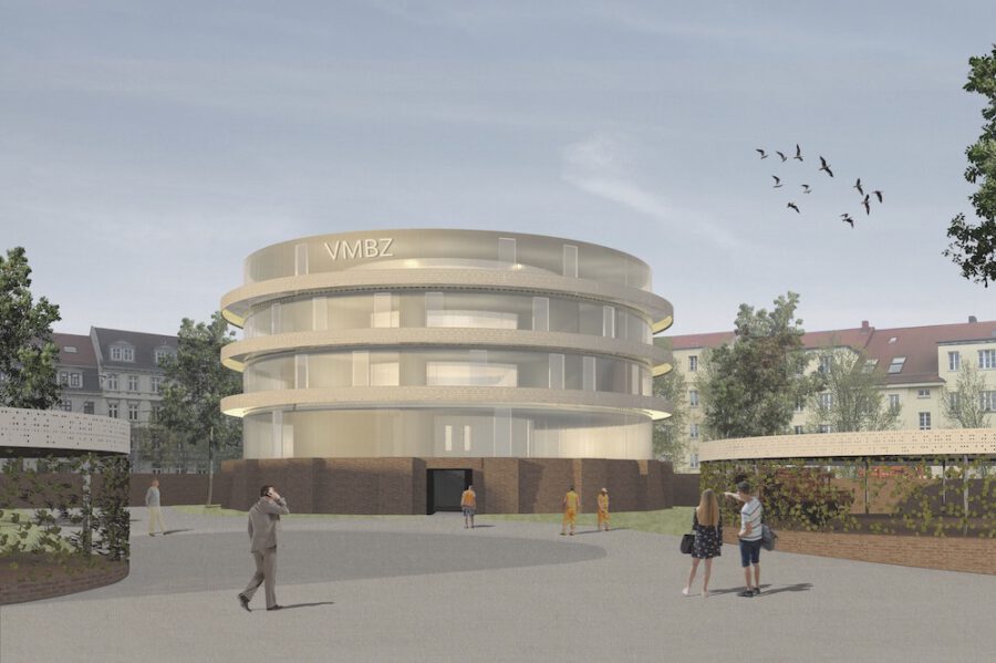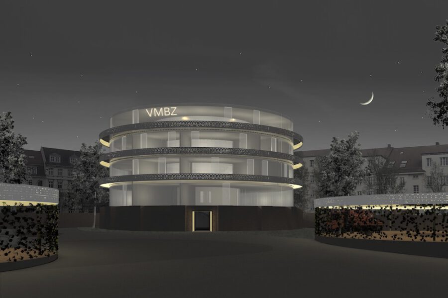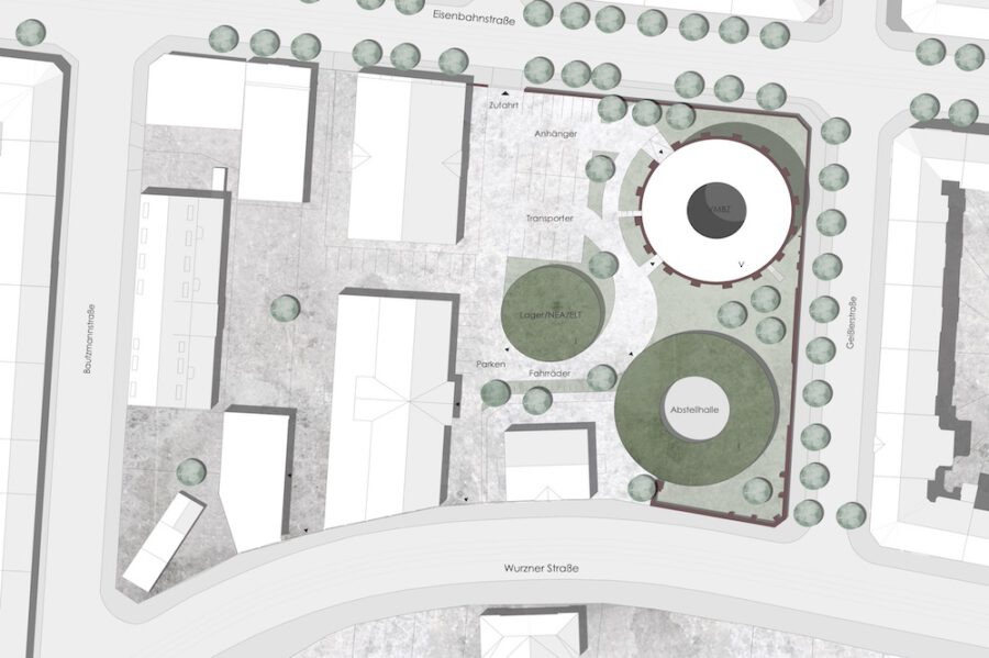 Auf den Resten eines ehemaligen Gasometers im Leipziger Osten soll ein Gebäude mit Büros, Leittechnik und Lagerräumen entstehen. Die runde Form der Bestandsmauern bestimmen die Form. Das Muster der Brüstungen erinnert an Lochkarten. Balkone kragen aus und garantieren den Sonnenschutz. Im Inneren wird eine klare Halle als Kommunikationsort formuliert.