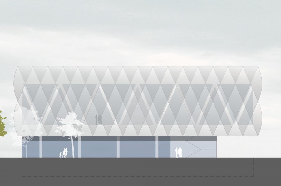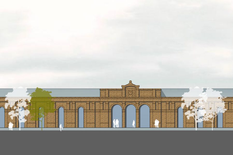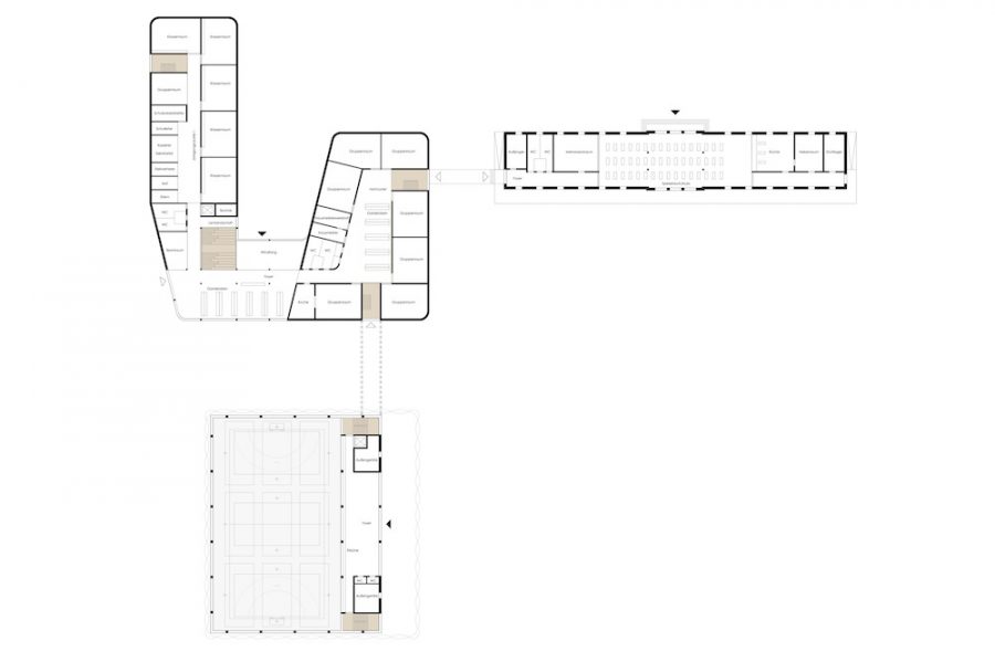 Im Bereich des ehemaligen Eilenburger Bahnhofes wird eine neue Grundschule mit Hort, eine KITA und eine Doppelsporthalle geplant. Der Park wir bis zum Gerichtsweg vervollständigt, die zarte Sporthalle mit gläsernem EG wird Teil des Parkes. Schule, Mensa und KITA bilden ein Ensemble im Norden und nehmen die Materialität der alten Empfangshalle auf.
